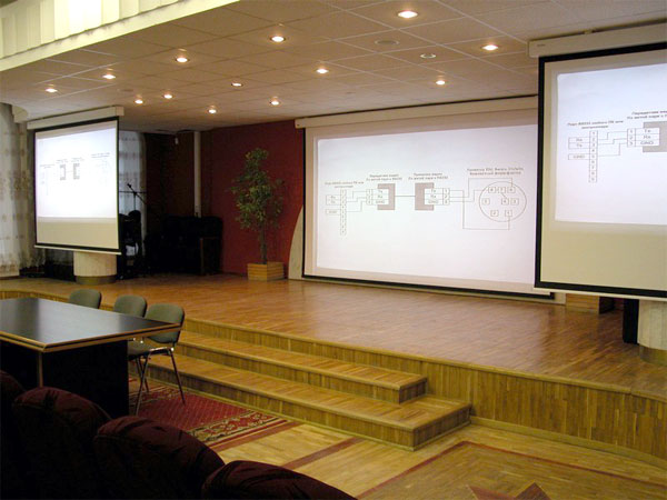 Актовый зал. Из-за особенностей зала синхронно используются три проектора с дистанционным управлением.