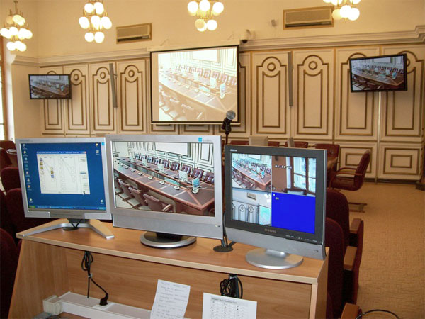 Зал совещаний. Различные устройства видеоотображения для всех участников.